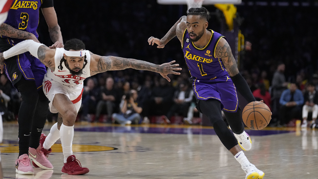体育新闻吉祥坊:洛杉矶湖人队的德安吉洛拉塞尔对阵多伦多猛龙队。